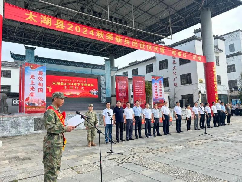 朱小兵代表县四大班子和全县58万父老乡亲,向光荣应征入伍的新兵战士们,表示热烈祝贺。他说,太湖这一方热土,素有参军报国的光荣传统,不论是战争年代,还是和平时期,都为军队输送了大批的优秀人才。在祖国的千里边防、万里海疆,处处都有太湖儿女的闪光足迹,时时传来他们立功受奖的捷报佳音,他们都是太湖优秀军人的代表,也是大家学习的榜样。