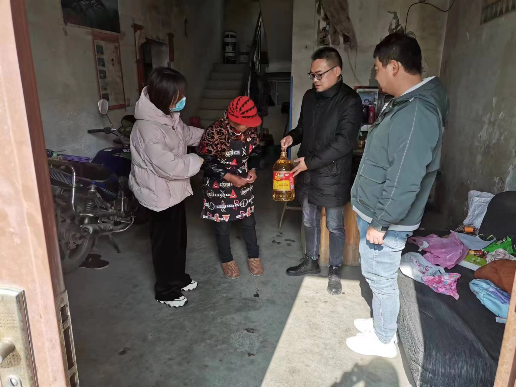 走访中,每到一户贫困群众家中,慰问人员与他们促膝交流,详细了解他们的生产生活情况,询问他们当前存在的困难、问题,嘱咐他们要保重身体,并送上慰问金、食用油等暖心慰问品。