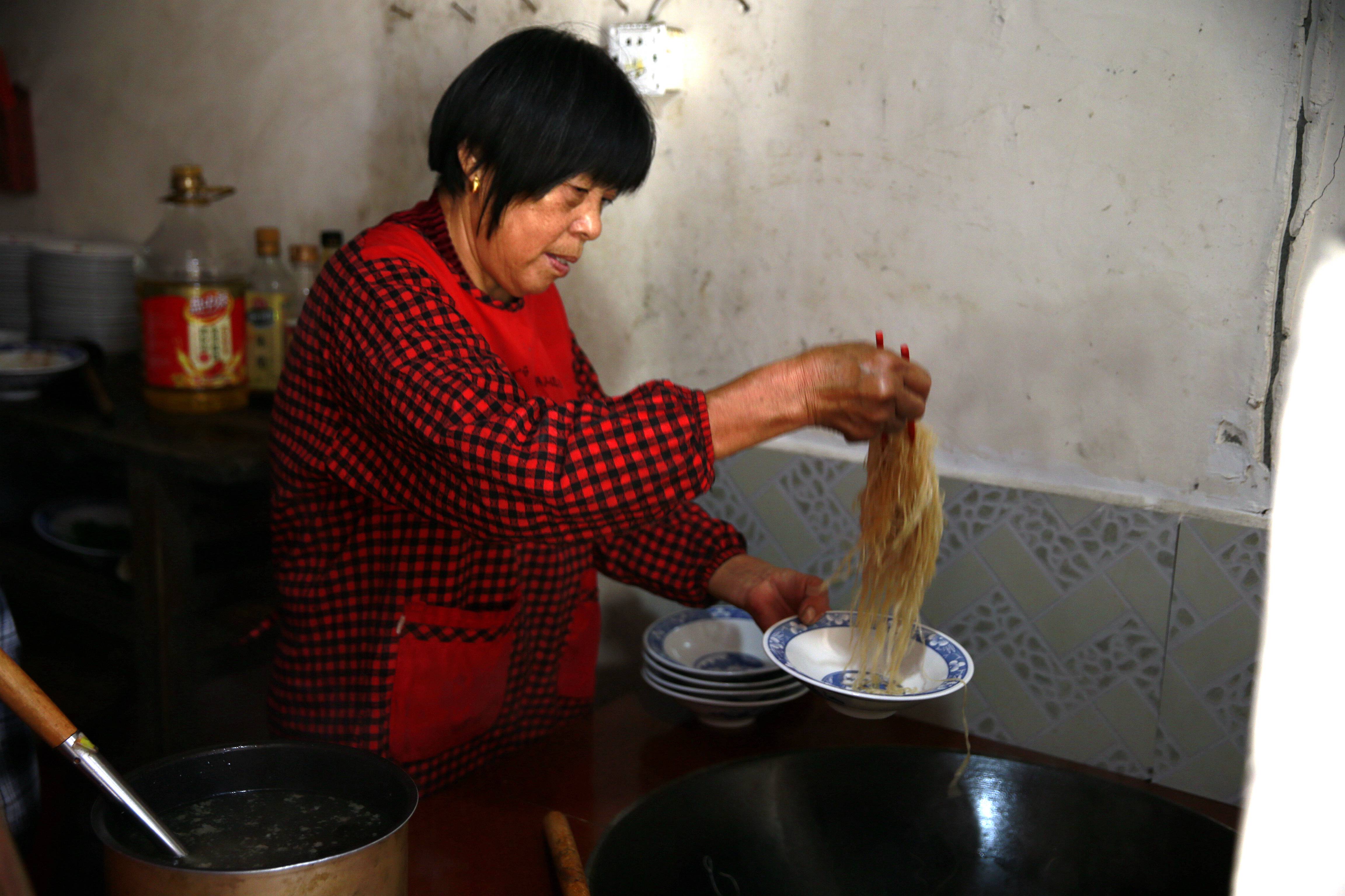 太湖县天华镇马庙村党员志愿者在为参加“长寿宴”的老人们上菜