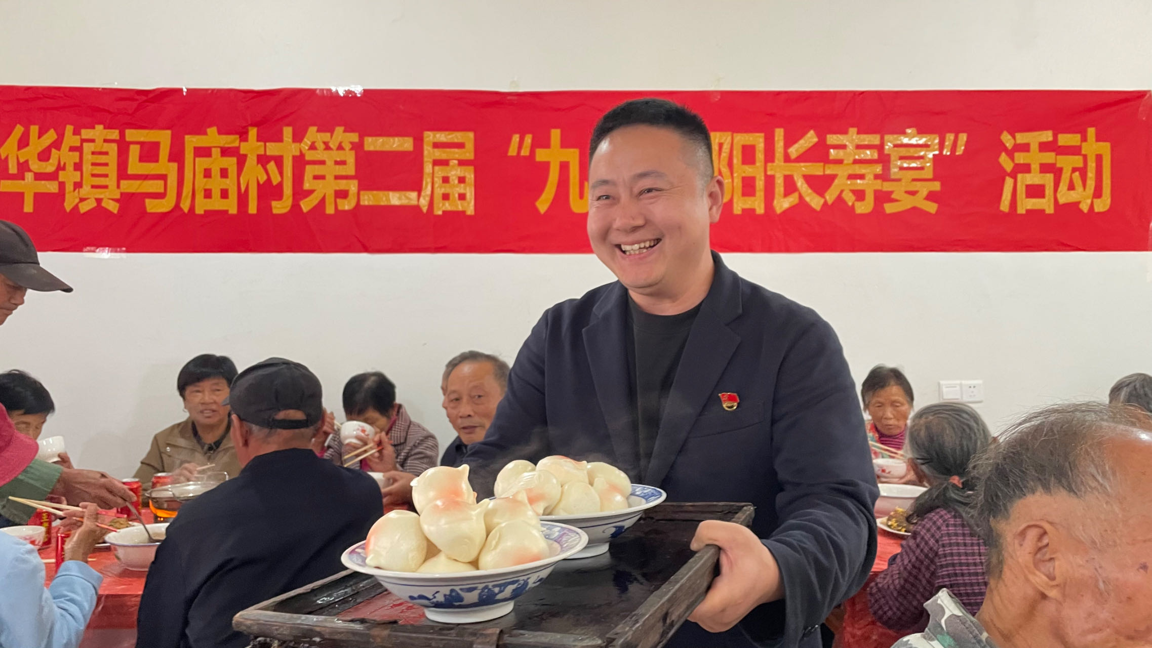 太湖县天华镇马庙村党总支、驻村工作队负责人在向参加“长寿宴”的老人们表达良好祝愿