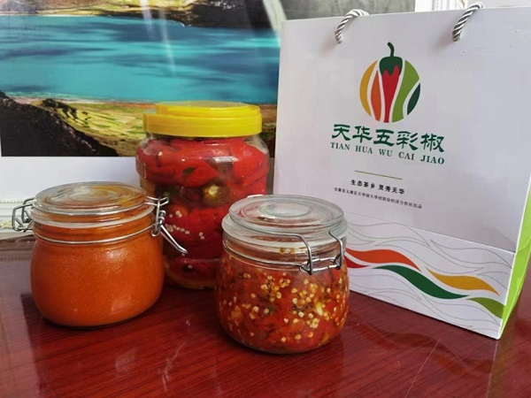 “今年的天气适宜辣椒的生长,辣椒的产量较去年翻了一番,我们又在去年的销售经验上改进了五彩椒品牌的包装设计,采用铝箔密封口,延长辣椒产品的保存期限。同时,增加辣椒的销售种类,除了销售辣椒酱、腌辣椒、辣椒皮、剁辣椒等形式的辣椒美食外,另外搭配天华村高山菜籽油和高山大米一起进行销售。每日采摘的新鲜五彩椒也可接受零售和订单销售。”天华村党支部书记朱承罕说道。