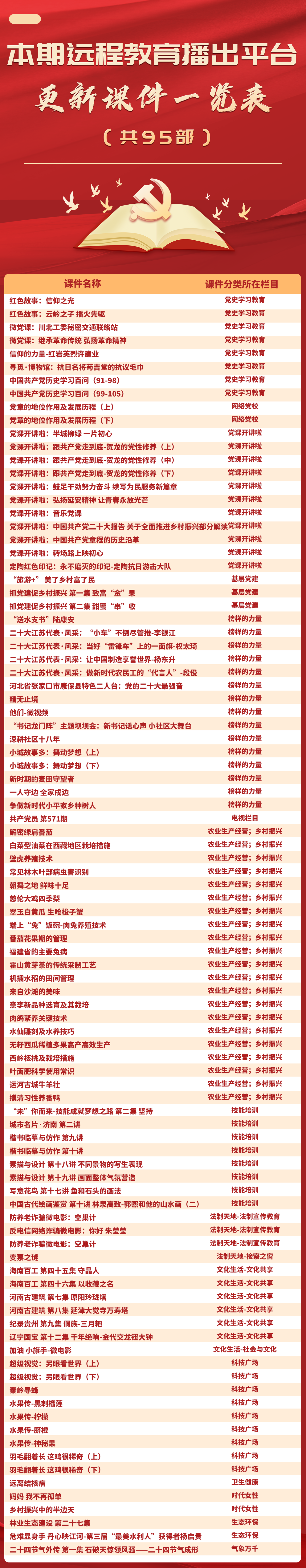 为进一步提升党员远程教育学用结合实效,帮助全省基层远程教育终端站点更便捷地掌握课件资源库内容,省党员电教中心通过安徽先锋微讯定期发布精品节目推荐以及最新上传更新节目单,请通过远程教育终端站点或安徽先锋网-先锋网视点播收看。