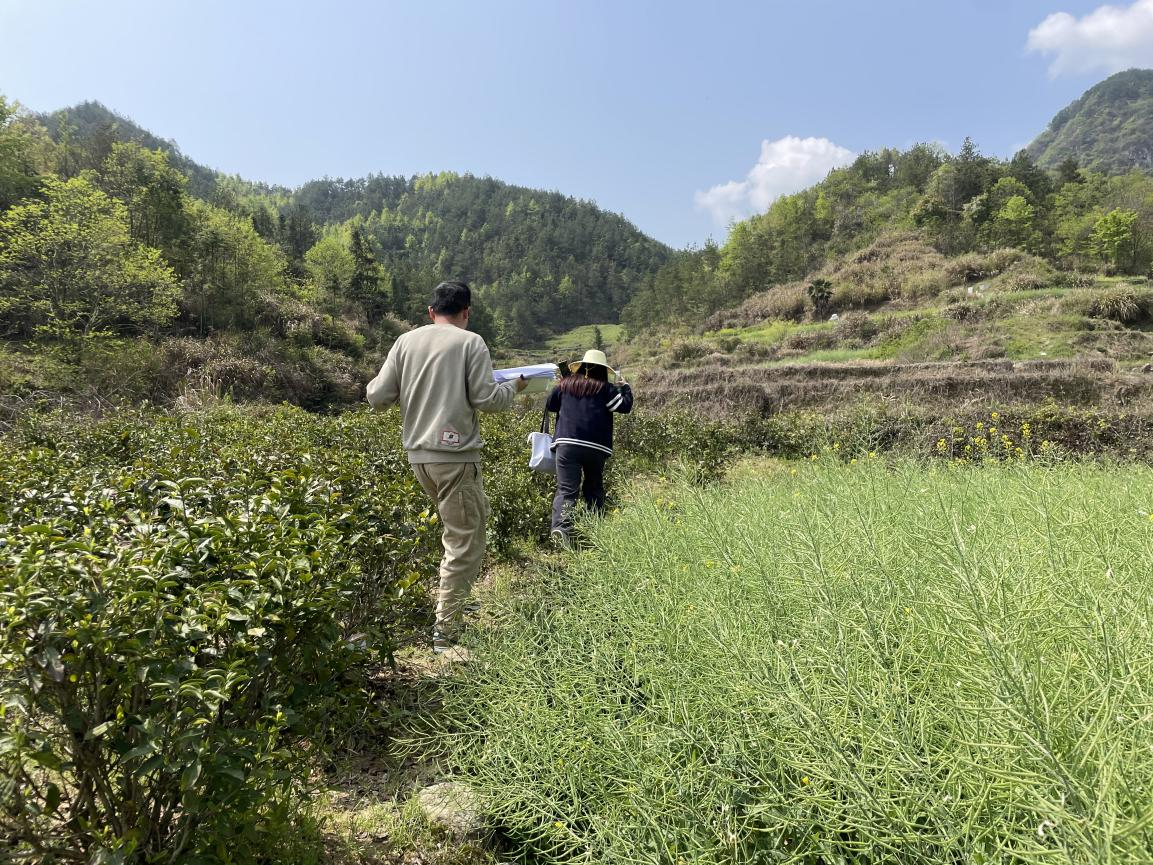 2023年4月11日,桐城市统计局詹主任和镇政府吴主任到村实地测量统计冬油菜播种面积。