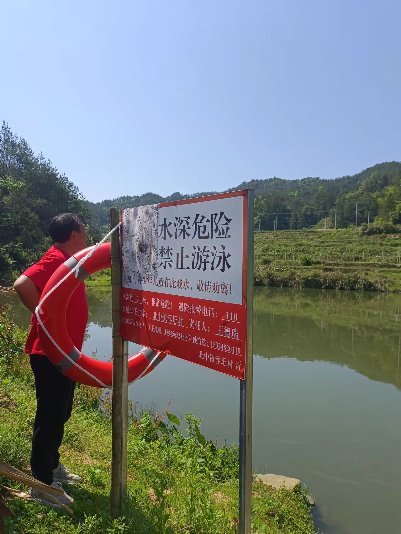 暑期将至,为预防青少年擅自到河流、水库、塘坝游泳、玩耍,发生溺水事故,敲响警钟,浮坵村村“两委”成员到重点区域开展巡察,增设、更换防溺水设备。