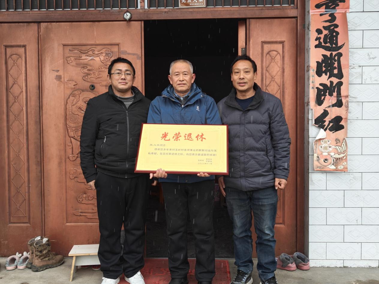 2024年2月6日,玉岭村领导为退休职工送光荣退休牌,并送上慰问礼品。