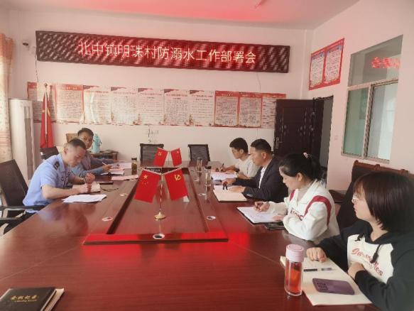 2024年5月11日,明珠村召开防溺水工作部署会,对防溺水工作压实责任到人,对重点水域、重点人群进行包保,在人群聚集区张贴横幅。