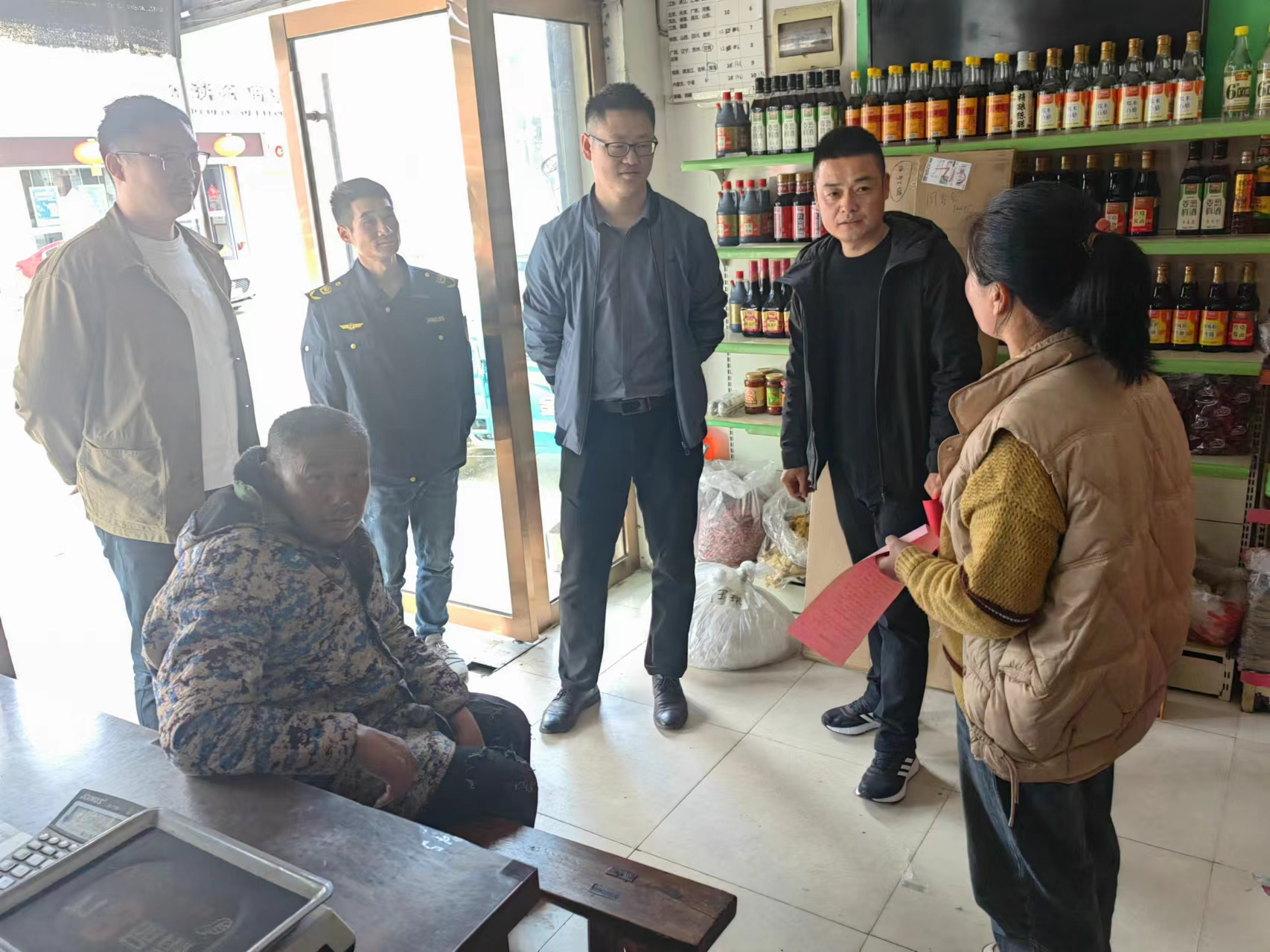 3月14日,镇政府周委员、盛镇长一行到村内商店查看清明花售卖情况,宣传清明节文明祭扫规定,从源头抓起,劝导商贩禁止销售清明花。