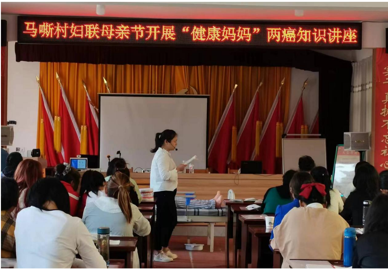 2024年5月12日,为庆祝母亲节并关注女性健康,马嘶村妇联成功举办了一场以“健康妈妈”为主题的乳腺癌和宫颈癌(简称“两癌”)知识讲座。本次活动旨在提高本村女性对两癌的预防意识与自我保健能力,营造关爱母亲、关注女性健康的社会氛围。