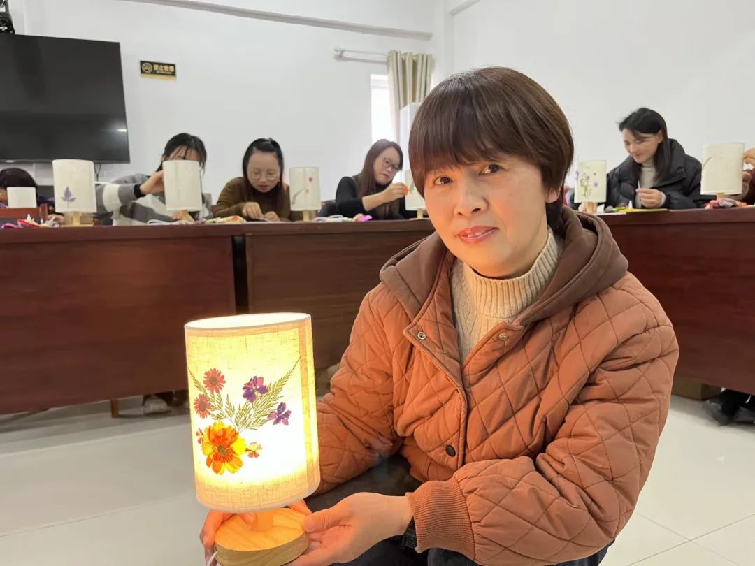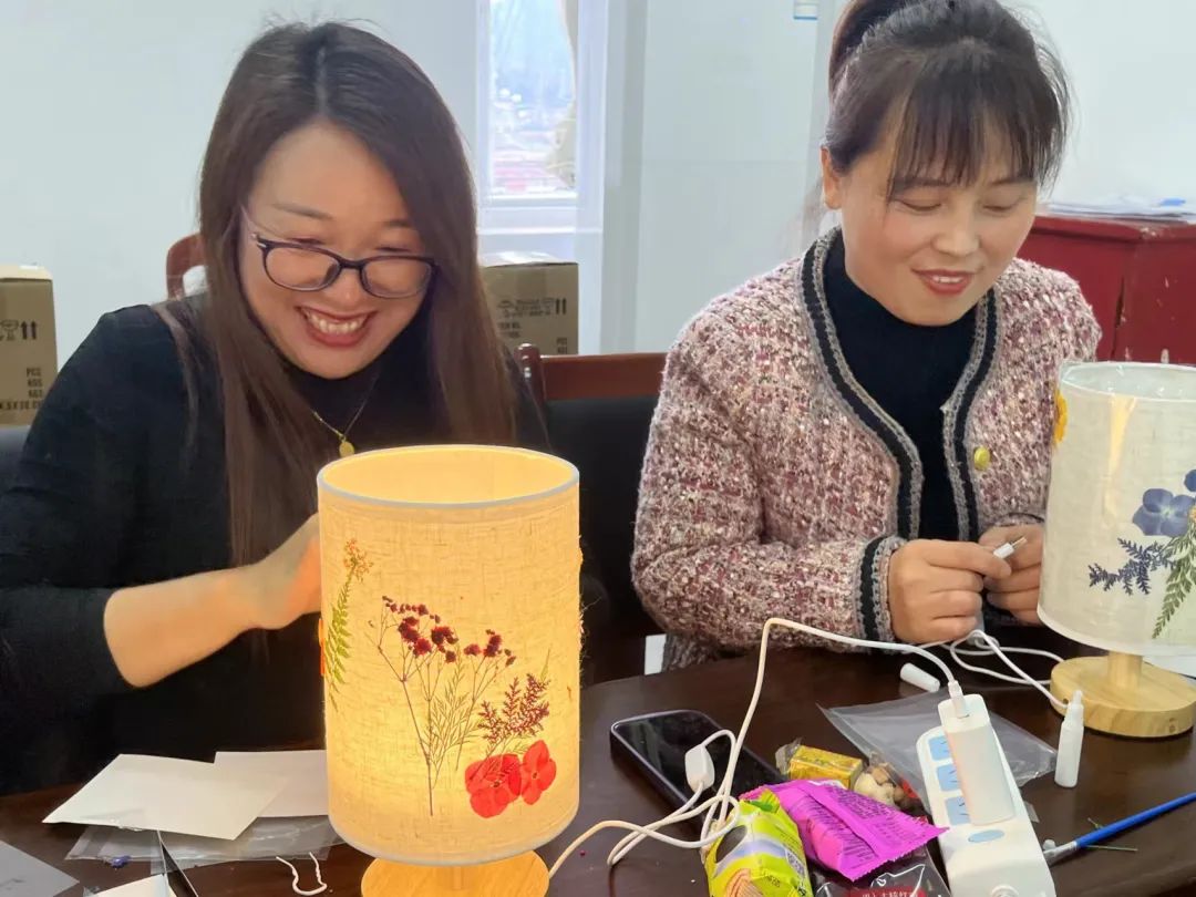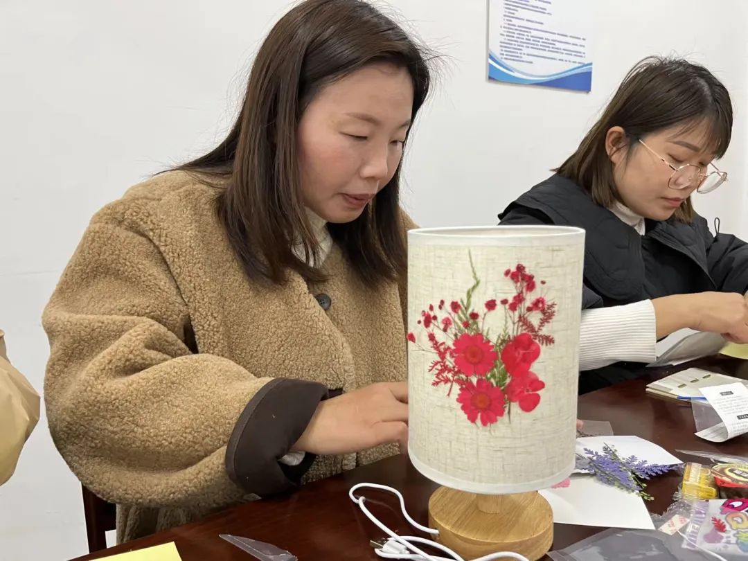 随后,一场别开生面的台灯DIY活动正式开始,大家结合各自手中的干花造型特点和审美情趣,不断在台灯上粘贴、调整、固定,创作属于自己的艺术品。很快,一盏盏独一无二的压花台灯在大家的巧手下诞生。在接通电源,暖黄灯光亮起的那一刻,大家都乐开了花,纷纷合影留念。现场欢声笑语、气氛温馨。