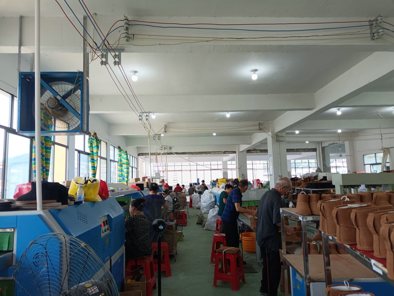 哒哒,哒哒哒哒……走进安庆泓锦鞋业加工厂车间,单针机、花样机、喷胶机、冲孔机等40余台机器正开足马力连轴运转,机车工作的声音不绝于耳,工人们忙着制作鞋面、定型、成型、包装……配合默契,动作麻利,车间内一派繁忙生产景象。