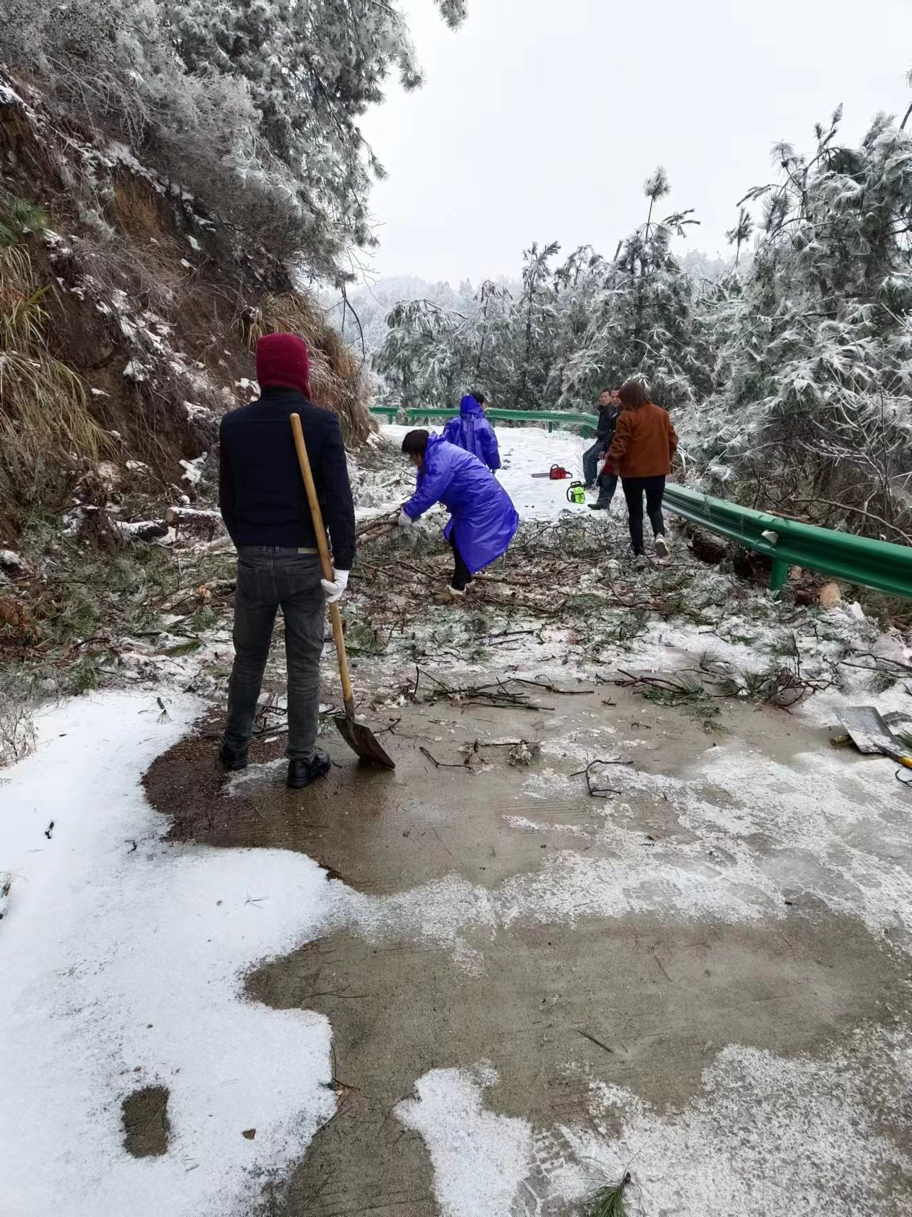 受持续低温冻雨影响,田家村通往松尖组,金华组等路段因冻雨导致大量树枝被压断迫使道路受阻,村民通行受到严重影响。