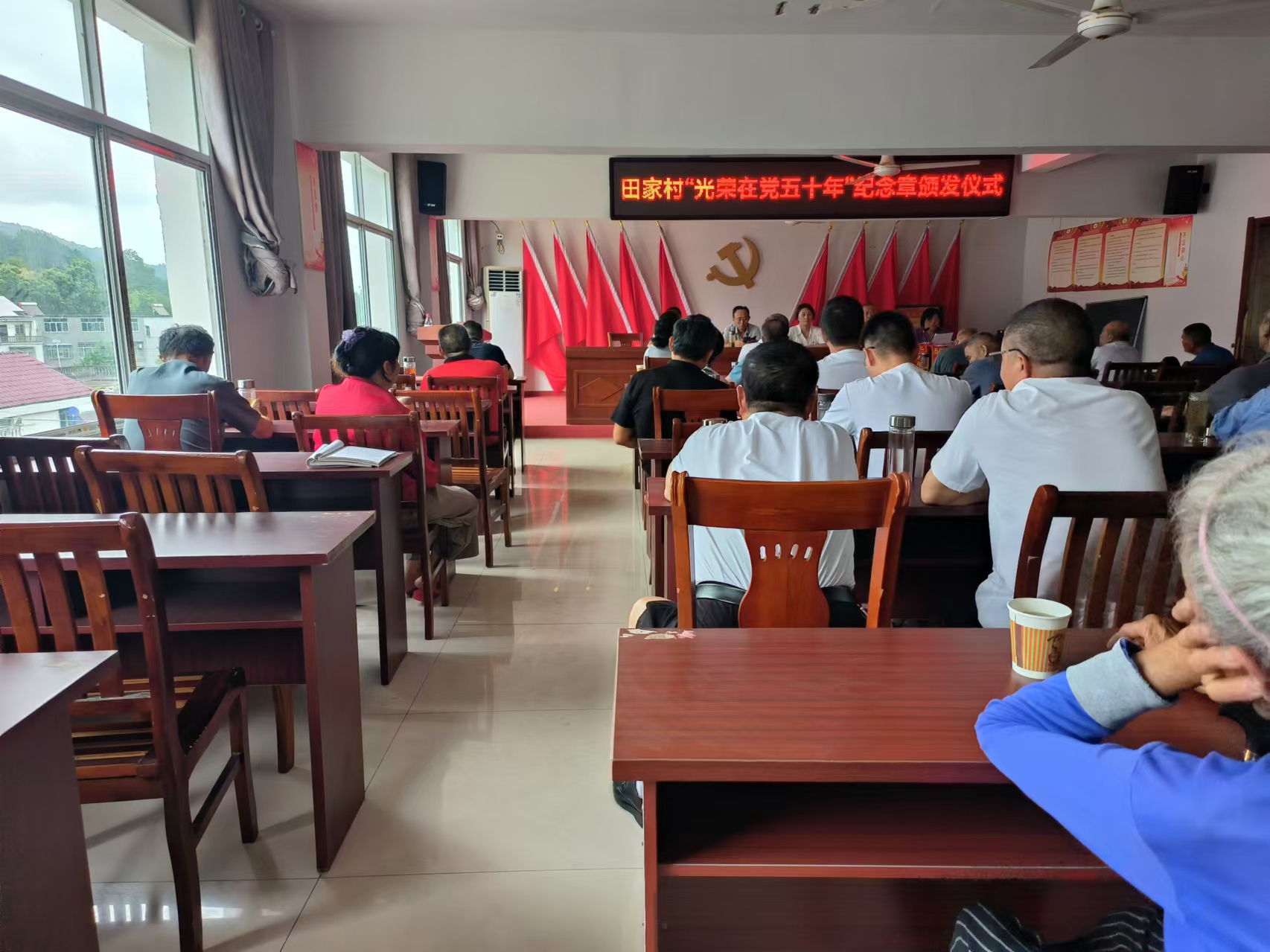 在建党103周年之际,田家村为光荣在党五十年的党员颁发纪念章