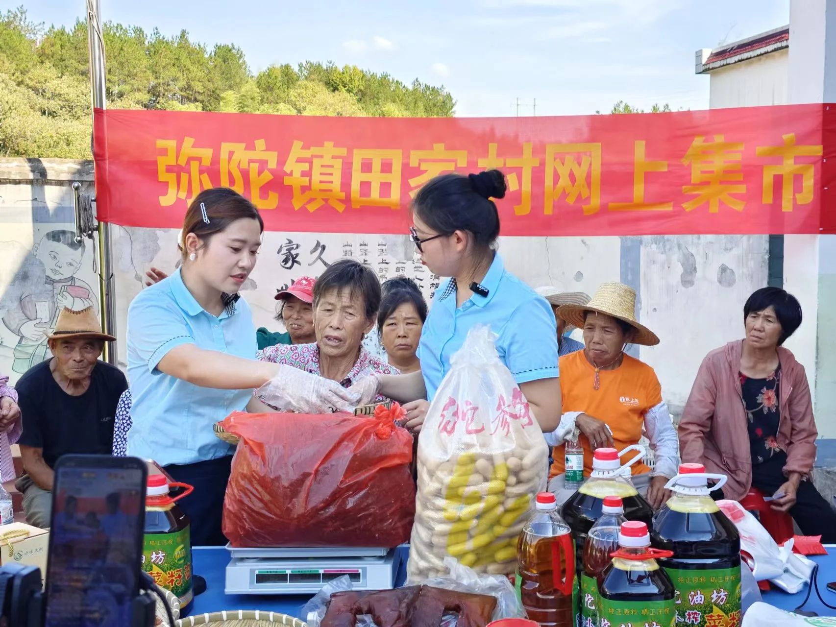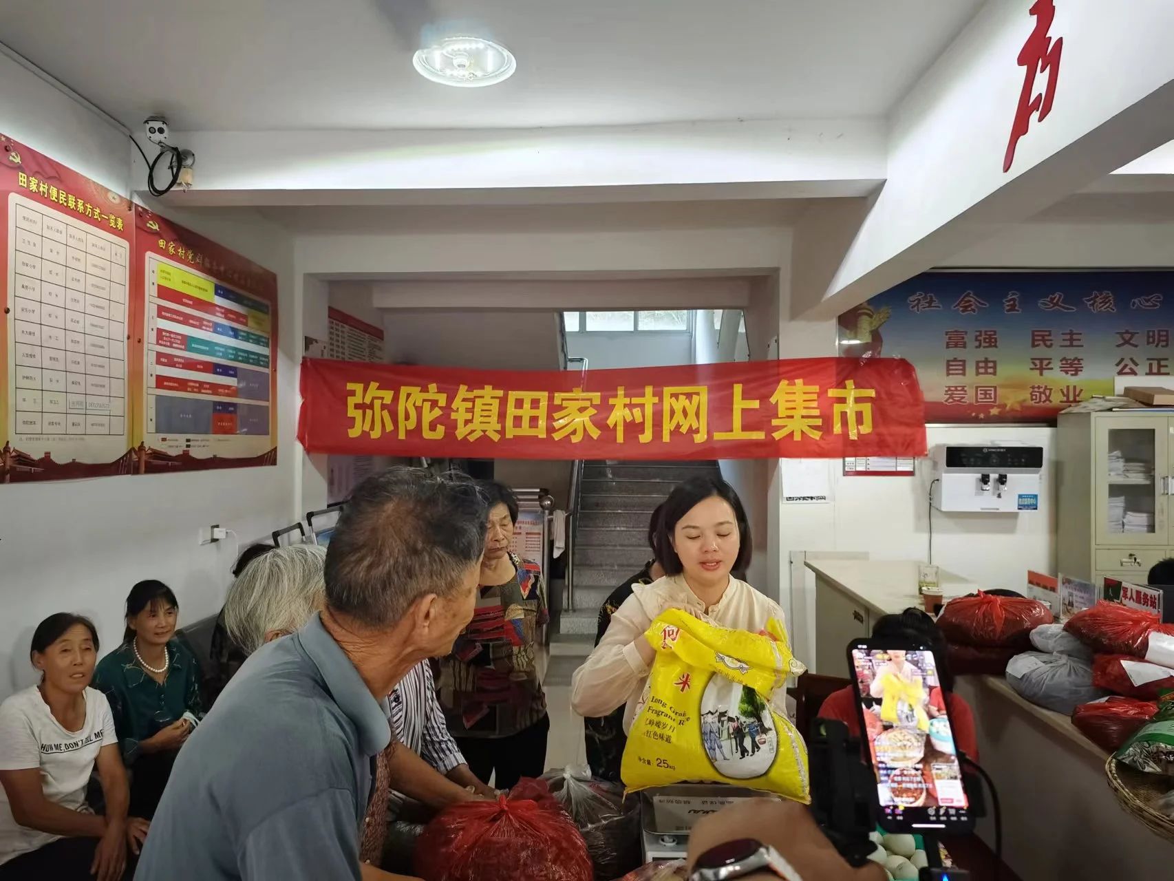 9月28日下午,在国庆节来临之际,弥陀镇田家村驻村工作队和村两委精心准备了一场别开生面的庆国庆活动,网上集市、村播带货,正在如火如荼地进行。由田家村携手专业电子商务团队“九个挑夫”和网红主播共同打造网络集市,依托“中国邮政”等直播间,弥陀镇首场直播助农活动田家专场走进网友视野。