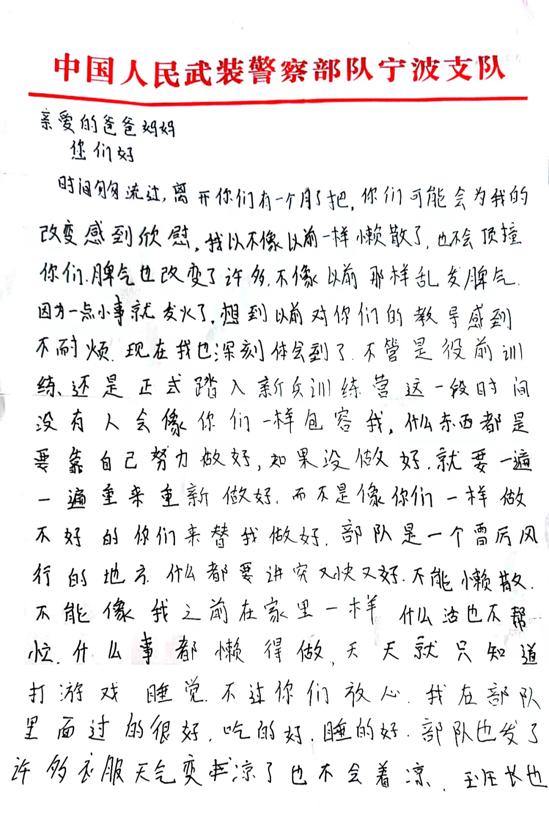 见字如面、纸短情长,陈龙的家书没有华丽的辞藻,也没有精心的修饰,但字里行间充满了军旅百味,三个多月的加钢淬火、三个多月的成长蜕变,他褪去了稚嫩与青涩,收获了自信与坚定,这一封用血性与豪情做底色的家书,寄托的不仅是思念牵挂,更多的是矢志强军的坚定信念,是强军有我的无悔青春。