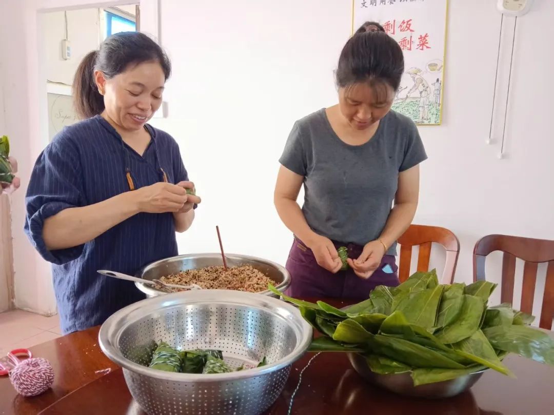村里的老老少少围坐在一起,一边说笑一边包粽子。老手们动作麻利,粽叶在手里三折两卷,填上糯米、红枣,再用棉线一缠,转眼就是个漂亮的粽子;年轻人也跟着学,哪怕包得歪歪扭扭,脸上也笑得灿烂。
