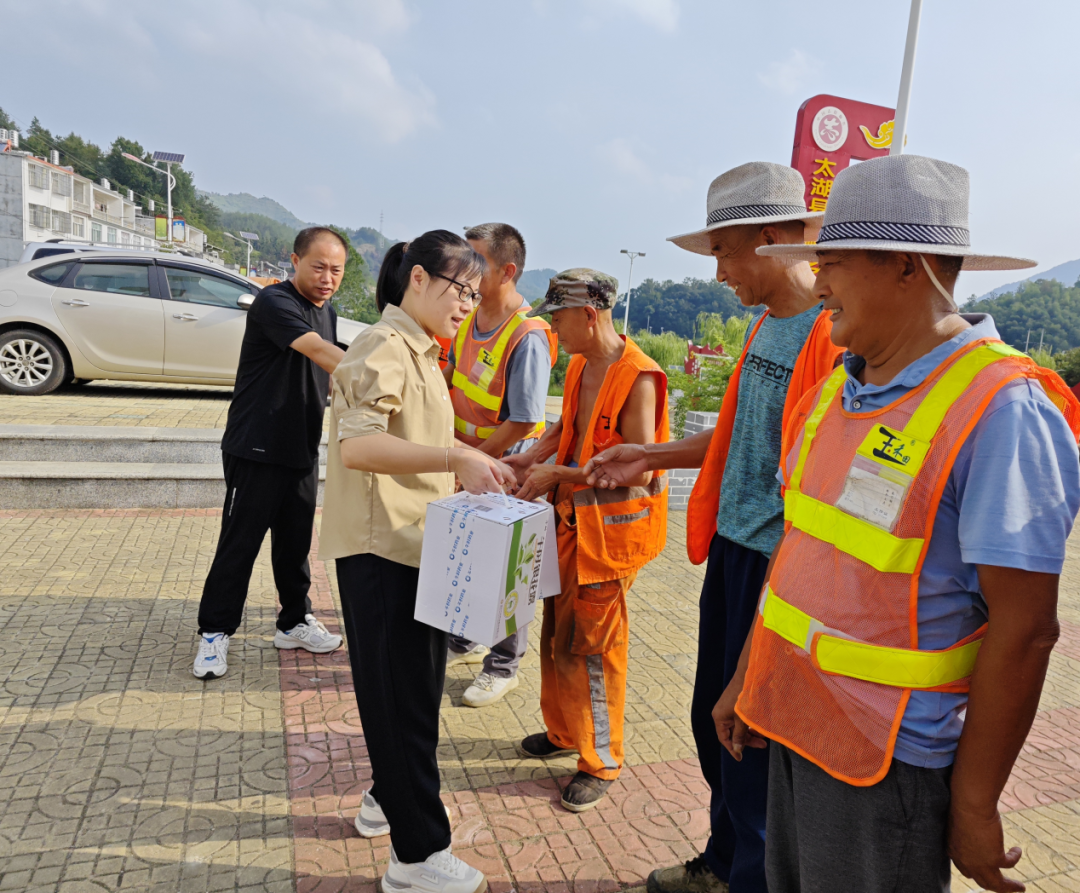 close为进一步做好高温天气下环卫工人劳动?;すぷ?,切实维护环卫工人的劳动和生命健康权益,9月6日,刘畈乡总工会组织开展了“情系环卫工,送清凉慰问暖人心”活动,把清凉送到劳动一线,将党和政府的关怀及工会组织的温暖送到环卫工人心坎上,乡政府及工会主要负责同志出席活动。