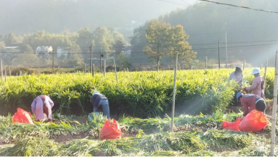 在这片土地上,放眼望去,一片片整齐的姜地绿意盎然,姜农林义洪与家人正忙着挖姜、拔姜、割姜叶,喜悦之情溢于言表。