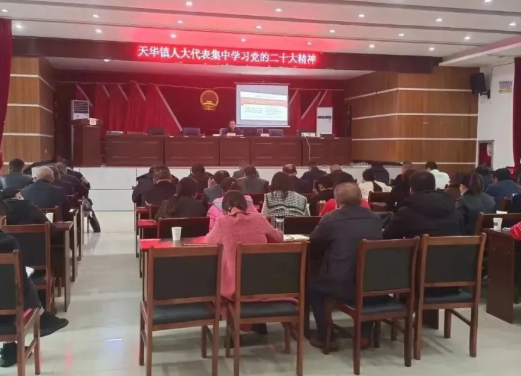 代表集中学习。天华镇组织县镇两级人大代表集中学习党的二十大精神,明确新时代新征程中国共产党的使命任务,聚焦“发展全过程人民民主,保障人民当家作主”板块深入学习。并要求代表们要把学习贯彻好党的二十大精神作为当前和今后一个时期首要政治任务,通过多种方式带头学习,推动二十大精神走心走实。