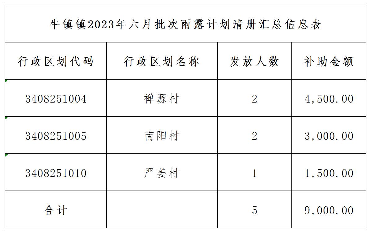牛镇镇2023年六月批次雨露计划清册汇总信息表