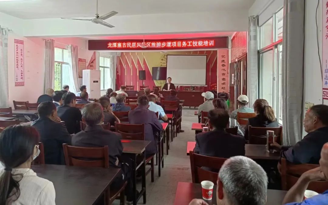 时下,正是暑期旅游旺季,在汤泉乡龙潭古寨景区,域域内外来此观赏打卡的游客络绎不绝。在景区一隅,龙潭寨古民居风景区旅游步道建设项目也已接近收尾,参与此次以工代赈项目的工人们正在进行最后的护栏安装。