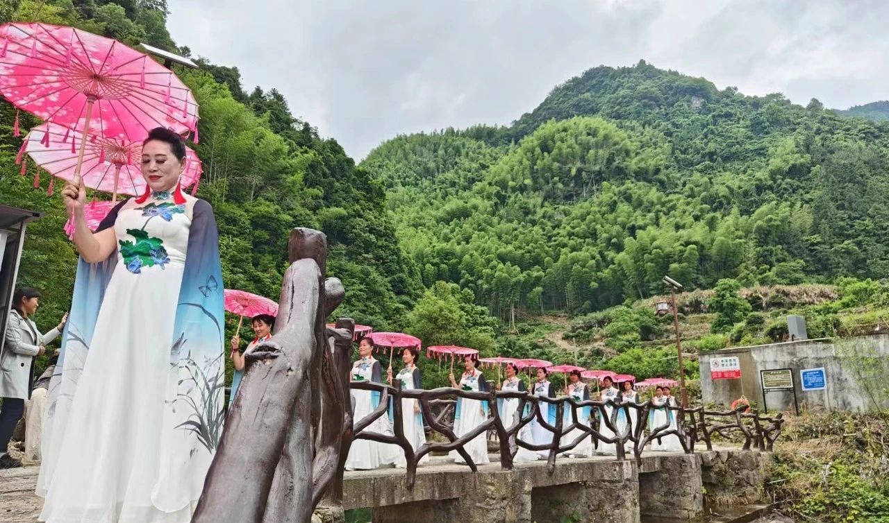 把秀场搬到山水之间,旗袍协会成员们行走在古村落步道上,撑起油纸伞,旗袍丝带随风飘扬,吸引不少村民和游客观看。她们在展示东方女性典雅气质、中国服饰之美的同时,也展示着美丽乡村新风貌,为乡村振兴助力。