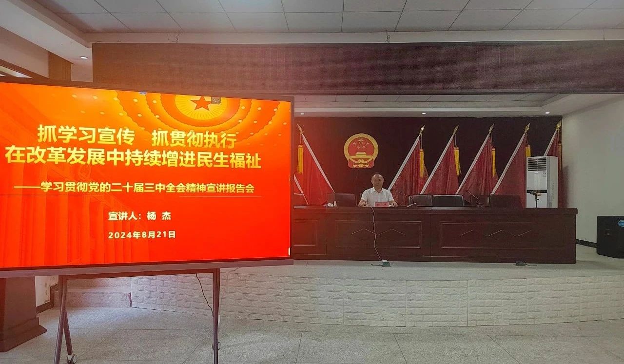 8月21日,汤泉乡召开学习贯彻党的二十届三中全会精神宣讲报告会。县委副书记、乡党委书记杨杰作宣讲报告,乡机关全体职工、乡直各单位主要负责人、各村两委成员、驻村第一书记、乡村振兴专干、村级后备干部等参加学习。