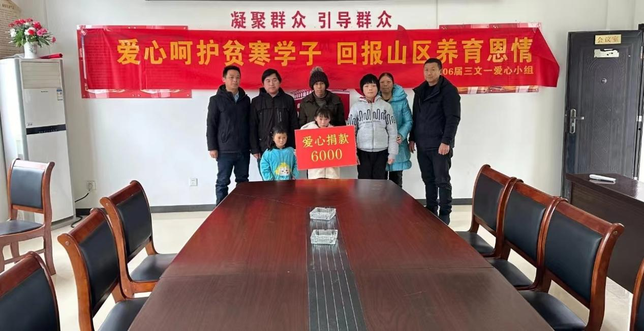 2月2日,汤泉乡朱湾村村委收到一份来自牛镇高中“06届文一班爱心小组”资助的6000元爱心款,并委托村委将爱心款务必在年前送到张倩、何依晨、何云龙三位同学家中,让他们置办些年货,过一个安心的新年。张倩、何依晨、何云龙三位学生均就读于朱湾小学,家庭条件极度困难,一直以来朱湾村村委积极寻求外界帮助,希望尽可能的帮助他们完成学业,缓解生活困难。牛镇高中“06届文一班爱心小组”了解情况后,第一时间发来爱心款项,因为气候等原因不能来到当地,只能委托村委转交,并叮嘱孩子们一定要好好学习,通过努力学习改变自己的命运。据了解,牛镇高中“06届文一班爱心小组”是由06届文一班几名同学自发组建,“大家都是从农村走出来的,希望能通过我们的努力改变更多农村儿童的命运,至少不要因为贫穷失去上学的机会。”爱心小组成员介绍他们自发成立爱心小组的初衷。生在红旗下,长在春风里。希望更多的爱心人士关注并守护农