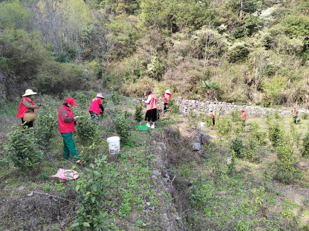 走近黄下村新屋组的茶叶基地,株株茶叶已吐露嫩绿的叶尖,黄下村的巾帼志愿者们正抢抓时机,采摘第一捧新芽。
