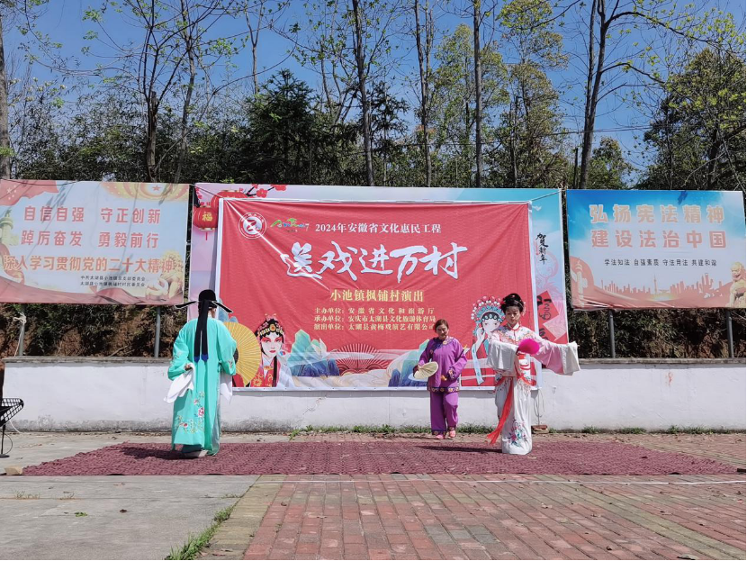 为丰富广大乡村居民的文化生活,推动乡村文化事业的发展,助力乡村文化振兴,4月5日上午,太湖县黄梅戏演艺有限公司到枫铺村开展送戏下乡活动,演出《不要白不要》《新孔雀东南飞》《游春》《谁料皇榜中状元》《瞧相》等一系列扬剧经典剧目,打通公共文化服务“最后一公里”,把公共文化资源送到百姓身边。