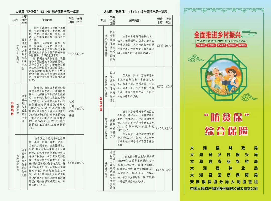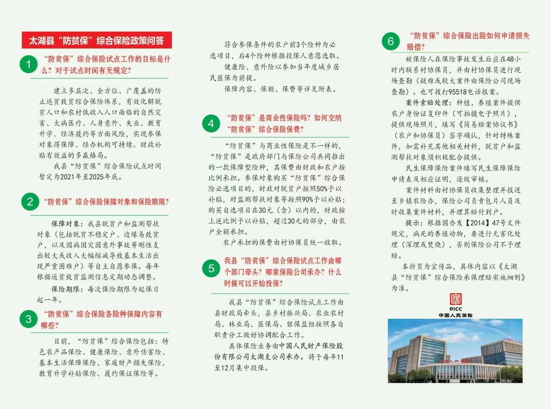 自2021年9月,太湖县正式实施“防贫保” 综合保险试点工作方案,由中国人民保险公司承保,以遵循政府引导、市场运作;精准施策、突出特惠;协同推进、优化服务为基本原则。