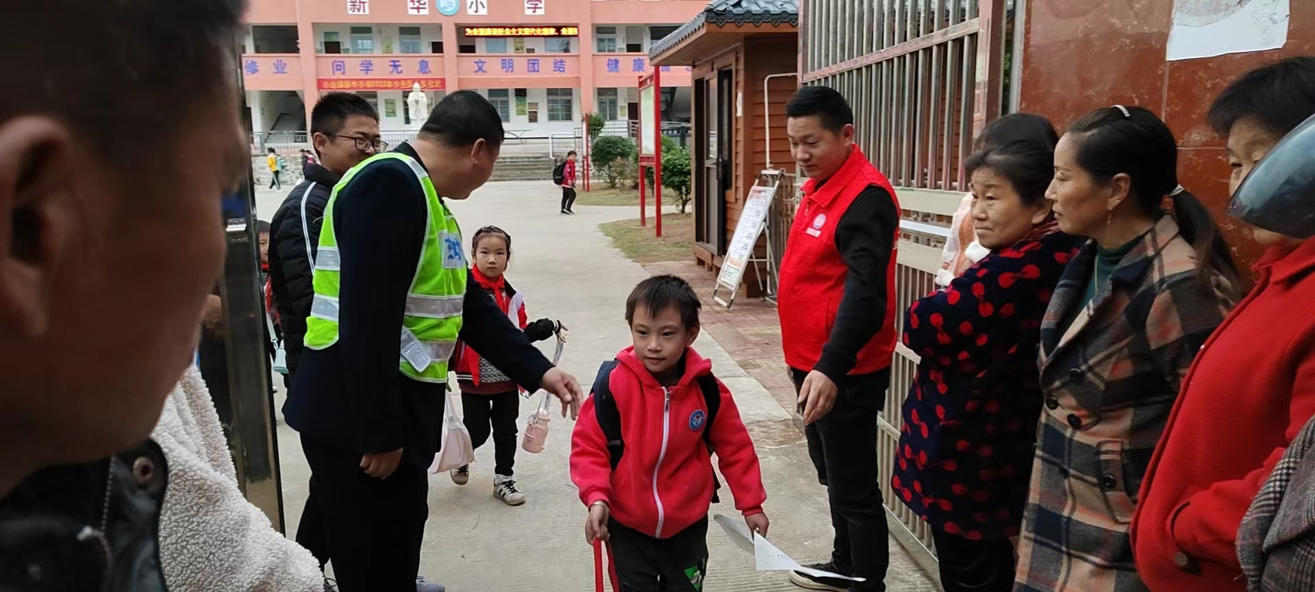 教育是一场爱的接力,场上有新华小学教师,场外有我们新华村委护学岗。新华小学放学高峰期,校门口接送孩子的车辆特别多,为确保学生上下学交通安全,道路文明。