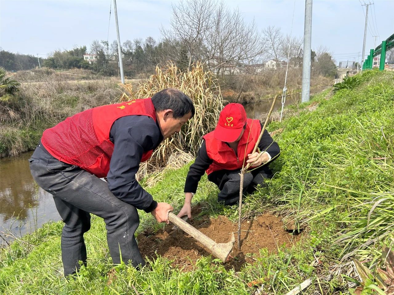 close最是一年春好处,植树添绿正当时。3月11日上午,在新仓镇花园村枫树河畔,花园村“两委”、护林员、志愿者们正挥锹铲土、扶苗填坑,各司其职、干劲十足,合力种下一颗颗青梅树苗,为大地增添一道靓丽的风景线。