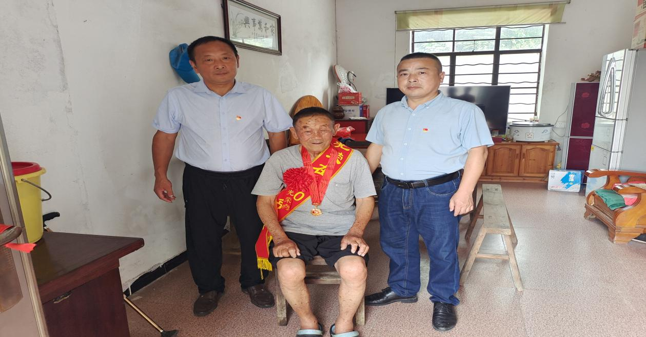 2023年7月1日,牌楼村“两委”到韦冲组老党员韦昌才户上门颁发“光荣在党”50年纪念章。