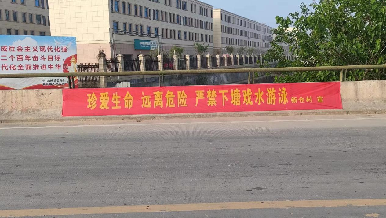 2023.4.20,新仓村“两委”到河边、塘边放置救生圈和悬挂防溺水标语。