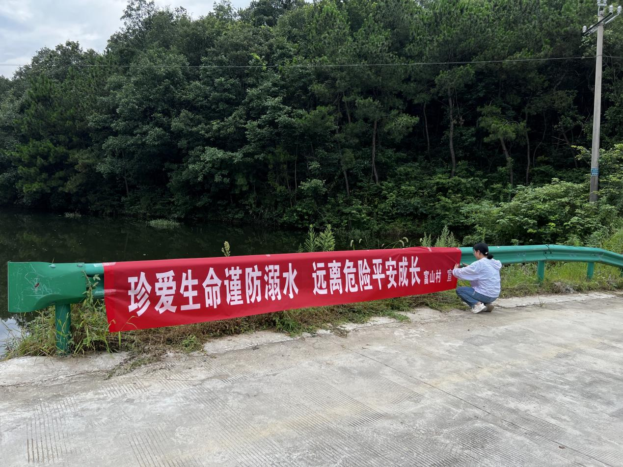 7月17日,富山村组织村干部入户开展防溺水宣传工作,并在危险区域置挂防溺水宣传横幅。