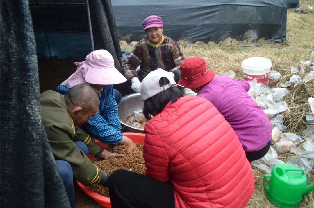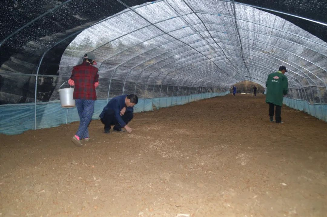 基地务工一位村民说:“我们一开始来就是做搭棚、拉遮阳网,拉好之后就平整地块,撒菌种、盖土、拉沟。这个季节不忙,我们这把年纪去不了远处,来村里基地务工,工资可以补贴家用,也可以照看家里”。