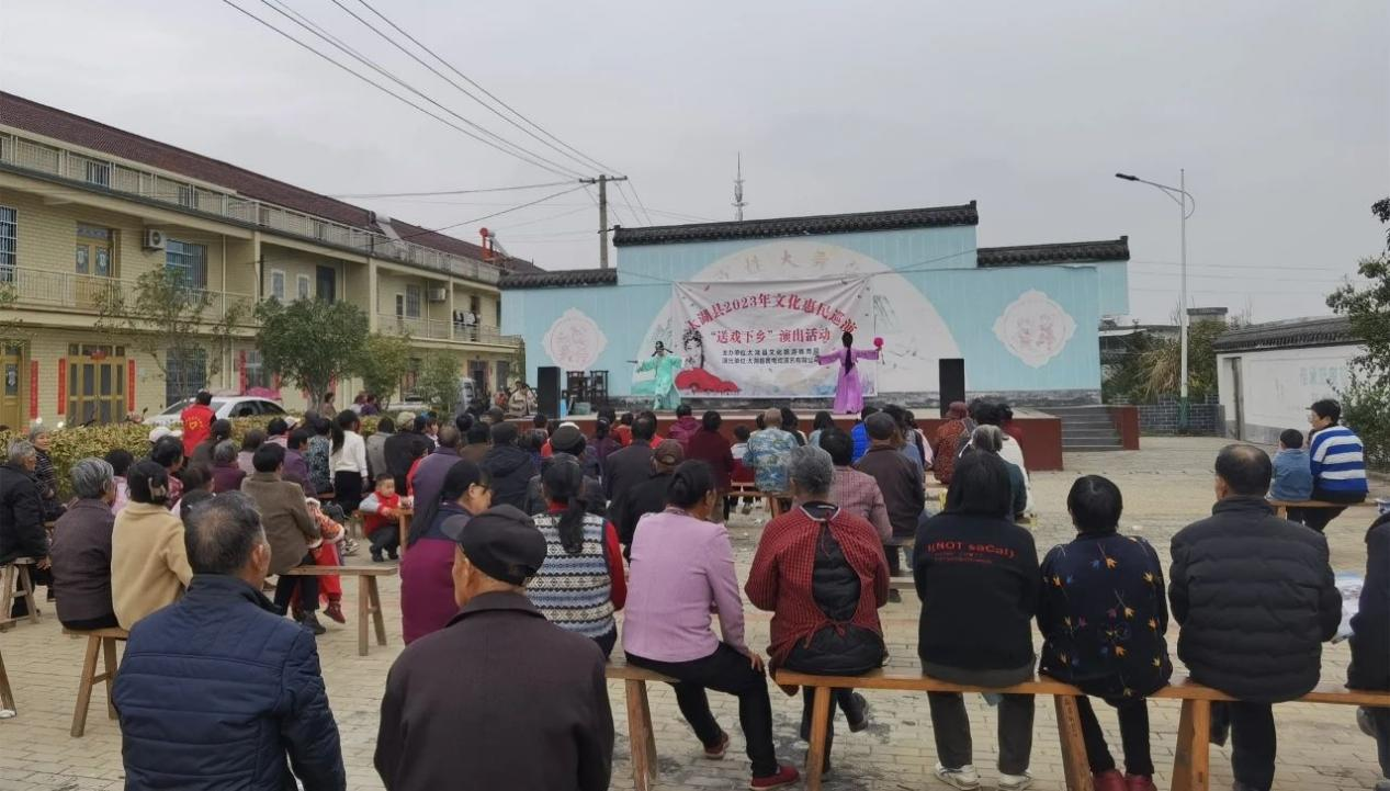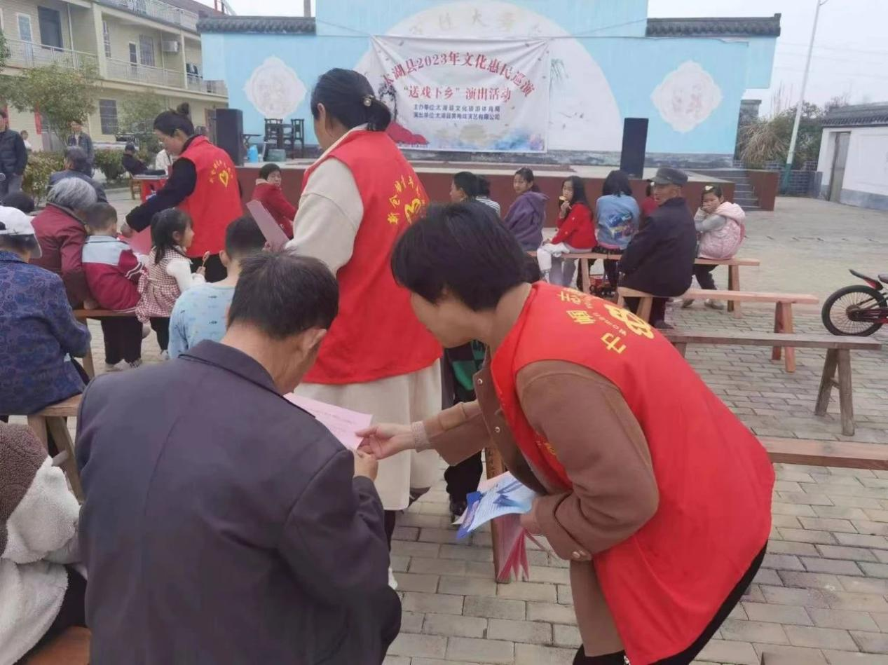 活动前,老人们早早地来到同兴村老年人活动中心,认真地观看张贴在墙壁上的入党誓词、党的一大到二十大全套党建文化宣传展板......有些老人围坐在一起聊着家长里短,不时传来阵阵笑声,呈现出一幅温馨幸福的晚年生活图景。随后,在同兴文化广场上,由太湖县黄梅戏演艺有限公司的演员们为大家送上了一道道戏曲文化大餐,节目内容有村民耳熟能详的黄梅戏《树上鸟儿成双对》、《闹花灯》、《女驸马》、《戏曲联唱》等经典剧目。演员们在热闹的锣鼓声中轮番登场,传统的唱腔、精湛的表演,让观众大呼精彩。在戏台下,欢笑声、鼓掌声此起彼伏,有些热爱戏曲的老人们还跟着演员唱和起来,现场气氛热烈,大家时不时拿出手机记录这精彩的表演瞬间。“党的政策越来越好,在家门口就能看到这么精彩的表演,我们这些老年人觉得日子过得舒坦、滋润极了。”老戏迷周大爷高兴地说。同时,在演出现场,志愿者们还广泛宣传了交通安全、反诈骗、居民养老保险和人居环境整治等政策宣传活动。