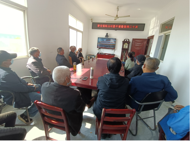 2022年10月16日新仓镇鸣山村村“两委”和老党员集中观看党的二十大开幕会。