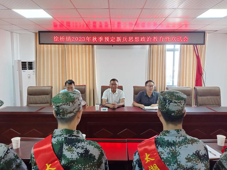 close9月11日,徐桥镇召开2023年度秋季预定新兵思想政治教育暨欢送会。徐桥镇党委副书记、镇长蒋志才,镇武装部长、村(居)两委、四名预定新兵及其家属参加本次活动。