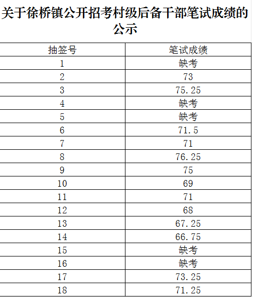 徐桥镇村级后备干部招考笔试阶段已完成,现将考生成绩予以公示。