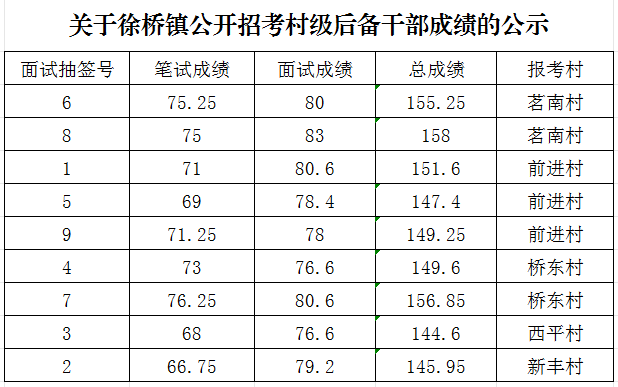 close公开招考徐桥镇村级后备干部笔试、面试阶段已完成,现将考生成绩予以公示,公示期5天(2023年9月15日-9月19日)??忌缍猿杉ù嬗幸晌?,可以携带本人有效身份证在公示期内向徐桥镇公开招考工作领导小组提出书面查分申请,逾期不予受理。查分范围仅限于答卷漏评、漏登、漏合和统分错误。