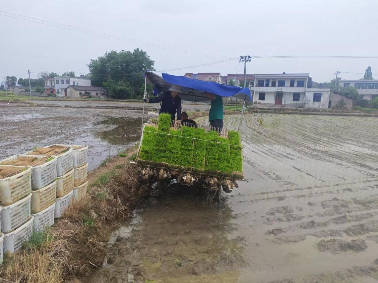 眼下正值水稻插秧的农忙期,走进西平村的田间地头上,呈现出一派繁忙有序的景象,伴随着机械的轰鸣声,小型插秧机缓缓驶入农田,快速精准地将一株株嫩绿的秧苗整齐地栽入泥中,为田间地头披上“绿衣裳”,展现出一幅绿意盎然的自然画卷。