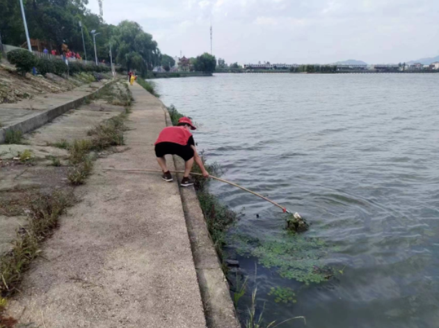 活动中,五老及志愿者们顶着烈日,不怕脏、不怕累。他们利用竹竿、沙网等工具清理东湖漂浮垃圾、水草等漂浮物,在不易打捞的边角处,大家互相配合,借助工具,将漂浮物或水草勾至岸边,与靠近岸边的人员配合一起拉至岸上,进行集中清理,确保做到水体无污染。同时向沿湖群众宣传人居环境整治相关政策,提高群众爱护环境意识,自觉参与、监督沿湖治理工作,杜绝向东湖中倾倒垃圾、抛杂物等不文明行为,共同维护东湖的环境卫生?;疃校蠹曳止っ魅?,相互配合,忙得热火朝天,忙碌的身影成了岸边一道亮丽的风景线,经过大家的努力,湖岸变得更加整洁、干净和美丽。