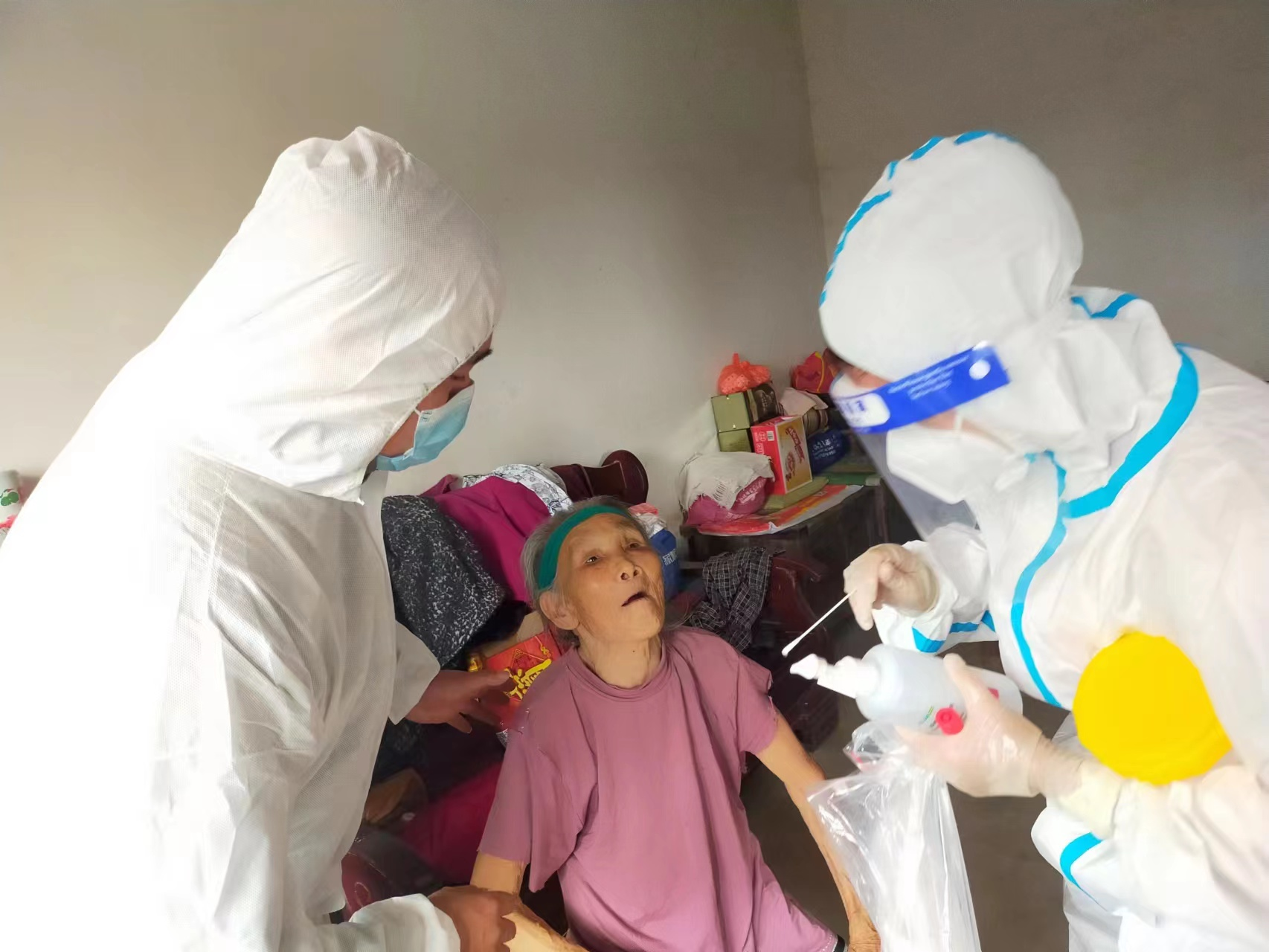 2022年10月4日,创业村开展全员核酸检测,工作人员上户为行动不便老人检测。