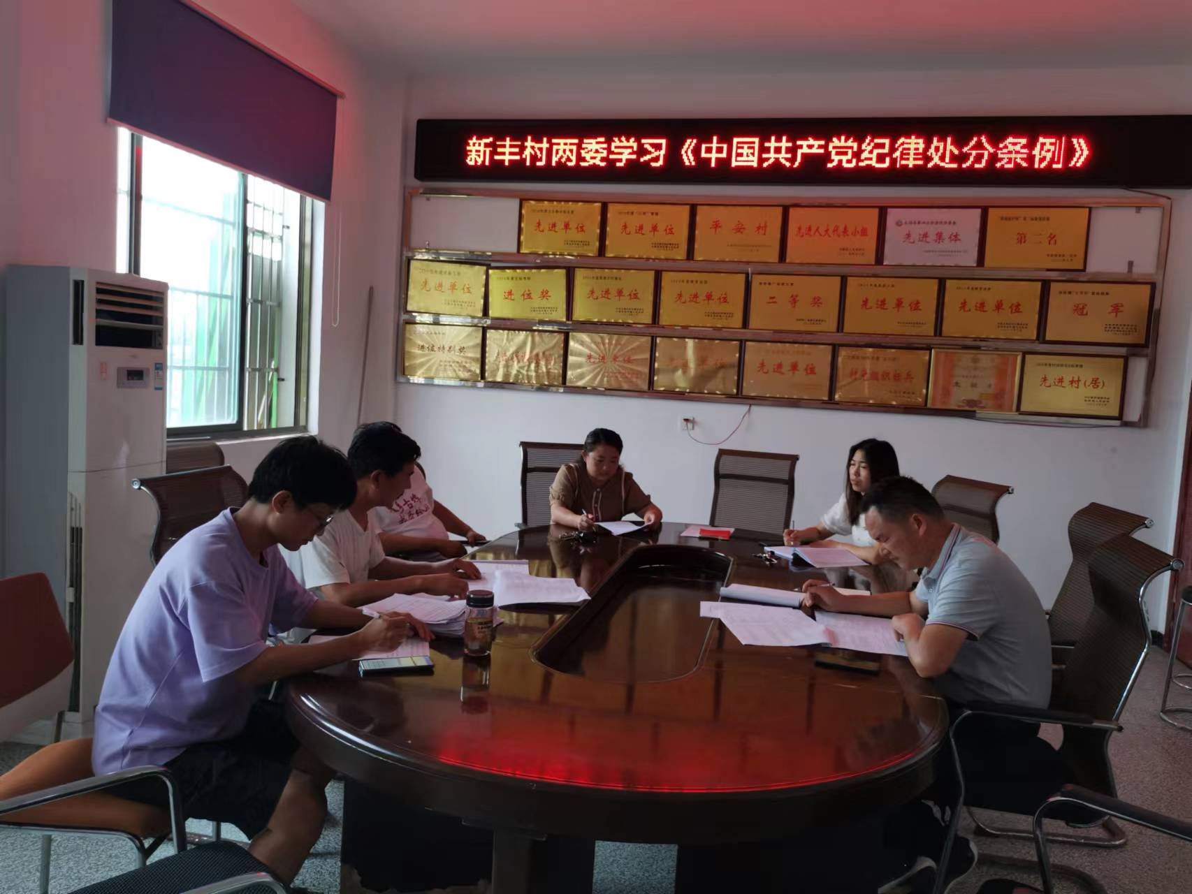 2023年8月2日,在村部会议室新丰村两委集中学习《中国共产党纪律处分条例》。