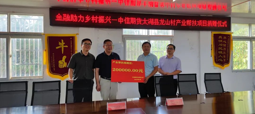 会上,中信期货与太湖县乡村振兴局签订了产业帮扶项目协议以及党建共建协议,为太湖县江塘乡龙山村产业项目发展提供无偿帮扶资金。随后,调研组实地考察了龙山村特色产业——农产品加工厂和小黄鸡养殖基地等项目,详细了解了项目运转及产业成效等情况。