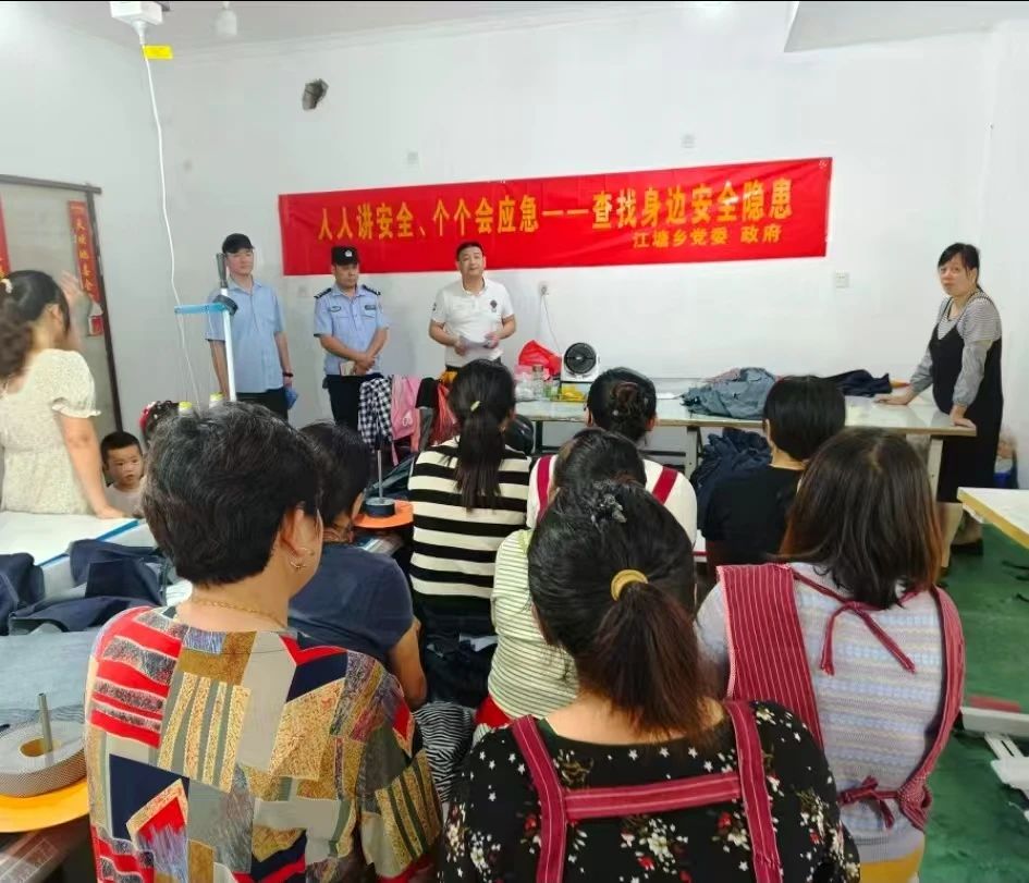 close今年6月是第24个全国“安全生产月”,为进一步提升辖区群众的安全防范意识和应急避险能力,6月10日,江塘乡组织平安建设和应急管理办、公安派出所等部门工作人员到辖区诚信制衣厂开展了以“人人讲安全、个个会应急—查找身边安全隐患”为主题的“安全生产月”宣传活动。