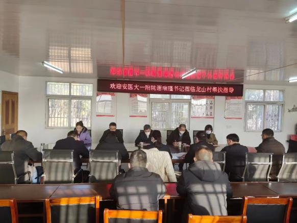 在龙山村,慰问组一行与村两委、医院驻村工作队召开座谈会,详细了解村级产业发展、村民脱贫后生产生活状况、巩固拓展脱贫攻坚成果同乡村振兴有效衔接有关情况;仔细听取医院驻村工作队驻村以来工作汇报,了解驻村工作队下一步工作想法和思路,关心询问他们在工作生活中遇到的困难和问题,希望驻村工作队成员强化责任担当,以党的二十大精神为统领,高质量开展驻村帮扶,为推进乡村振兴打下坚实基础,刘瑞瑾书记代表医院向龙山村捐赠帮扶资金40万元?;嵘?,双方还就村集体经济发展情况、移风易俗、文明创建、基层治理、党建+信访等工作进行了交流探讨。