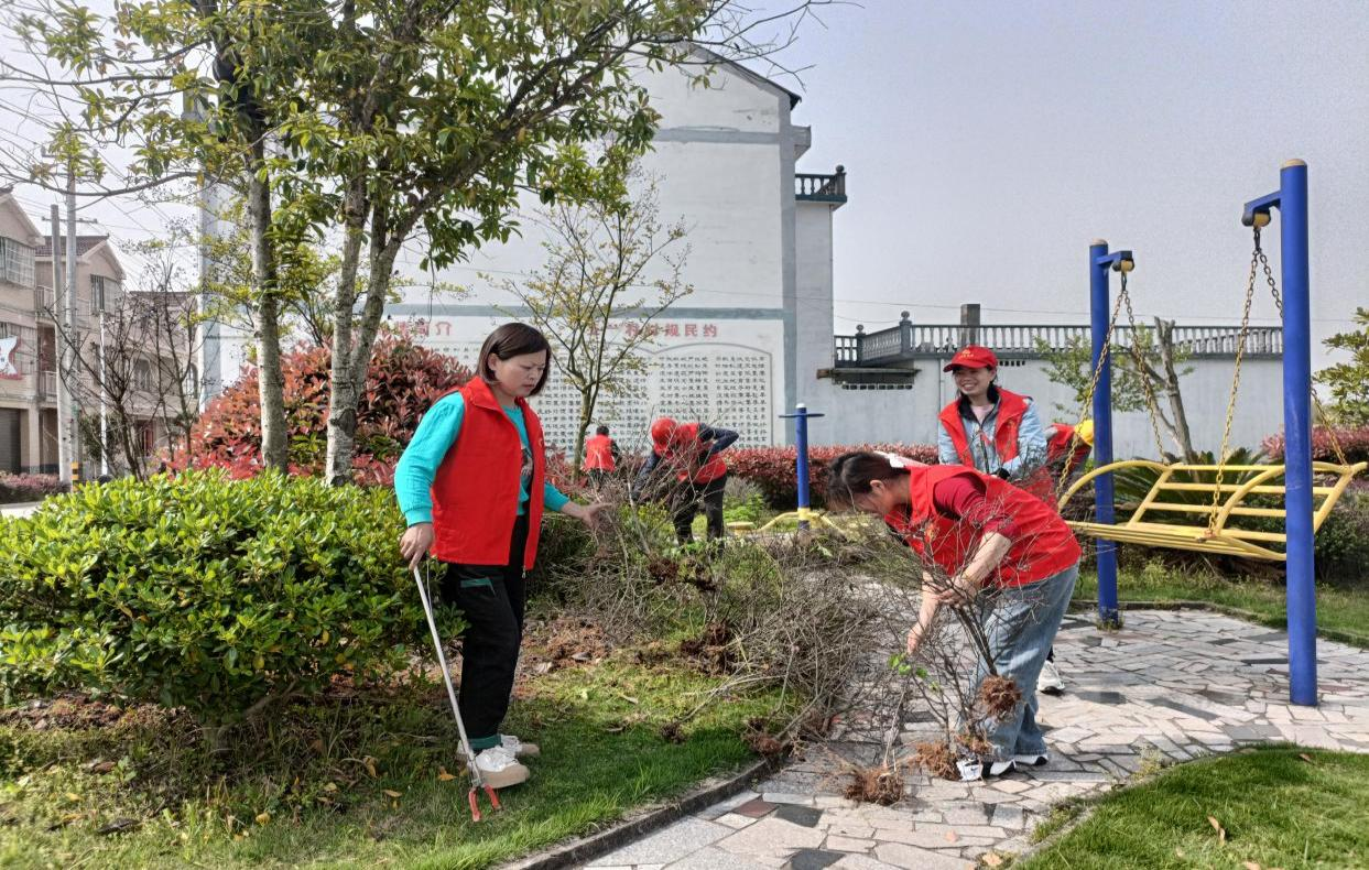 4月12日,召开党员服务队成员集中修建村部广场花草树木、去年干旱导致枯死的树木、清理广场周边的垃圾。