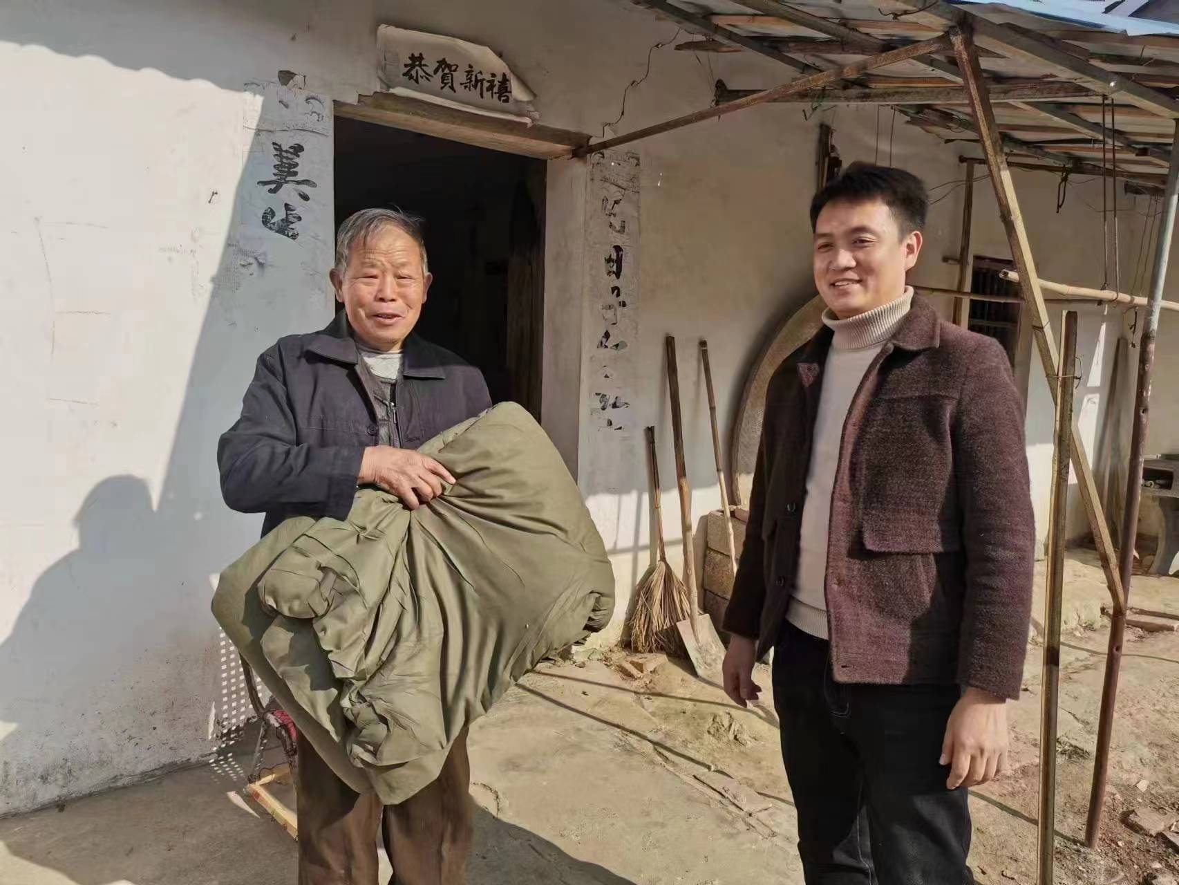 棉被、棉衣很常见,对村里孤寡老人来说有着特殊意义,它代表的不仅仅是一床被子一件衣服,更是一份温暖一份关爱。当日上午,在老人陈的毛家,村工作人员一边发放御寒物资,一边嘱咐老人注意保暖,要做好疫情防控措施,常洗手勤通风,有任何困难及时与村联系。